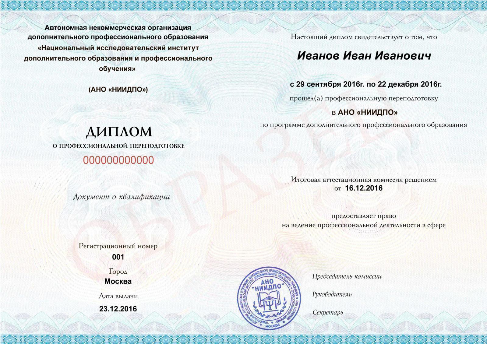 Государственного образца о среднем профессиональном образовании | Установленного образца о профпереподготовке от партнера – НИИДПО. |