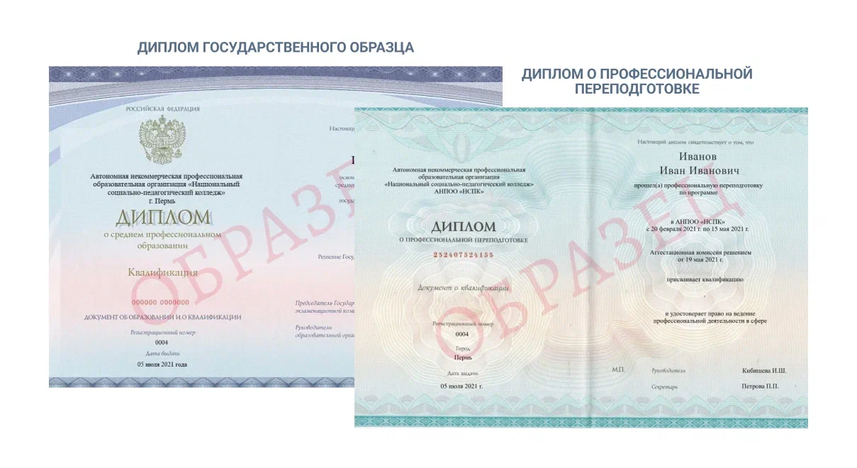 Первый — государственного образца о среднем профессиональном образовании. Второй — установленного образца о профпереподготовке.