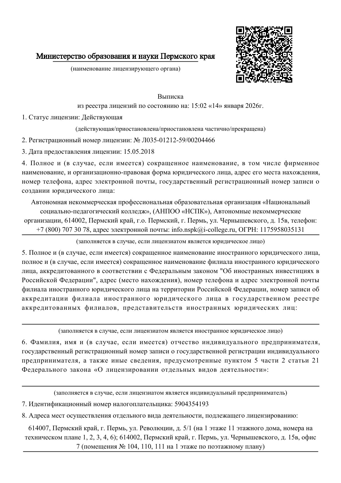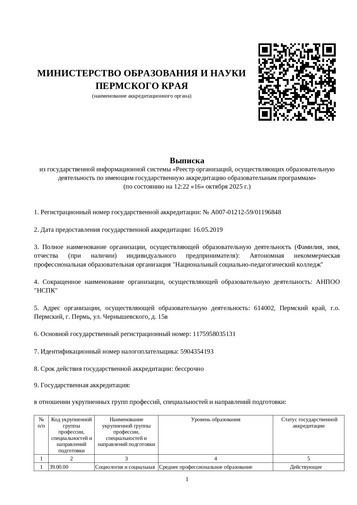 - Свидетельства о бессрочной государственной аккредитации выданной Министерством образования и науки Пермского края