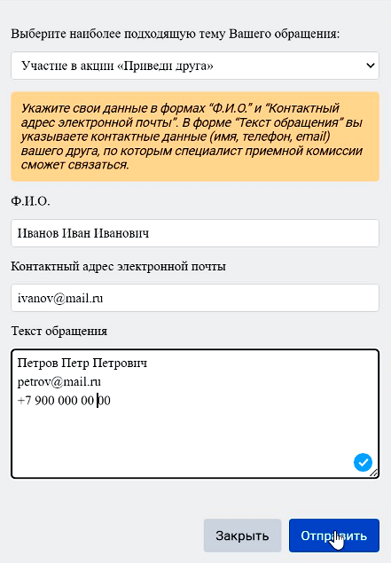 После получения данных специалист приемной комиссии свяжется с вашим другом.